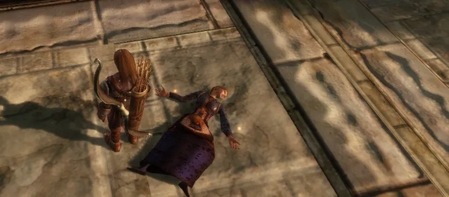 Можно отдать необходимую сумму, потребовать деньги самому (необходимо иметь Убеждение) или покарать наглецов мечом. Почти добитый предводитель разбойников прекратит бой и попросит пощады. С него можно содрать денег и отпустить, или добить (просто так или при попытке отвести к храмовникам) – все-таки эта шайка не гнушалась убийствами, и лежащий неподалеку труп в характерной броне тому доказательство.