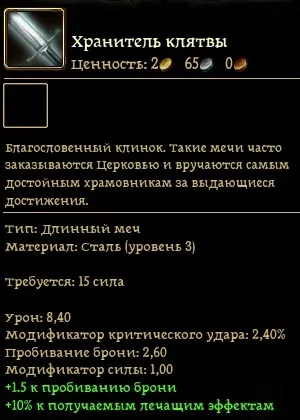 После выполнения всех трех квестов Церкви брат Девонс подарит вам неплохой для данного уровня меч Хранитель Клятвы.