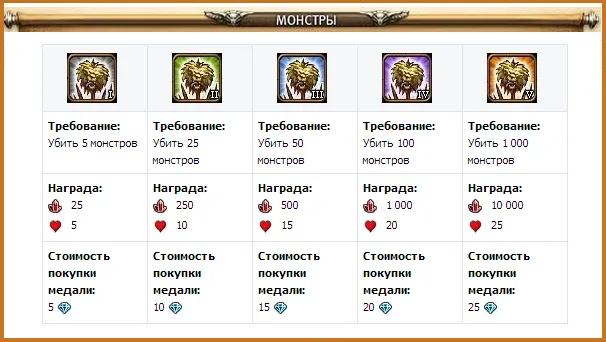 Набивая монстров мы получаем сразу несколько медалей - за победы и количество уничтоженных монстров.
