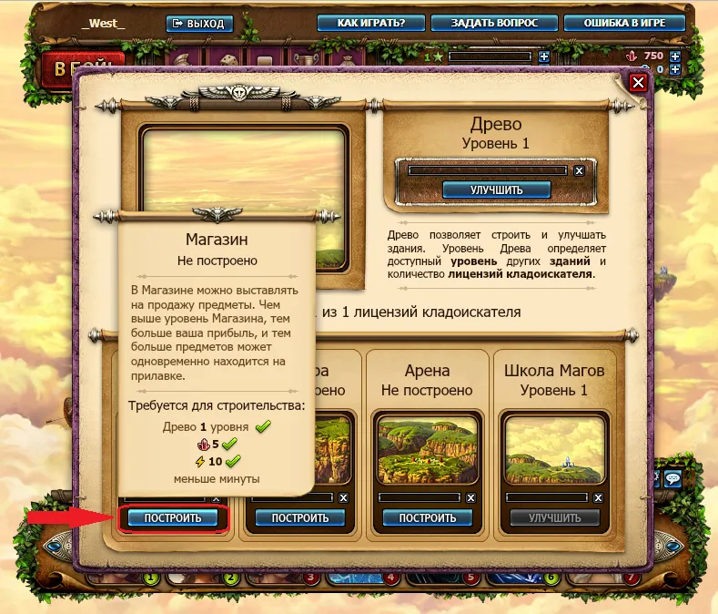 Открываем "Древо" и за считанные секунды строим магазин, пещеру, арену