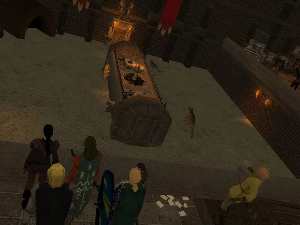 С работой покончено, Вы решили прогуляться вокруг арены. По традиции, здесь стоит поизучать статуи, еще этот район приятен любителям послушать интересные истории. В местной таверне выступает бард, а недалеко от складов на юге торговец грызунами Динг Траш рассказывает эпопею о берсерке, в духе «Сурка» Бетховена. У него же Вы купили хомячка и острижек ногтей в качестве корма ему. Когда Траш ушел, Вы освободили всех крыс из клетки. Водя носом в нужном направлении, зверек привел Вас к куче мусора, порывшись в которой можно найти вход в пещеру. Пещеру населяли хорьки, победив их, вы нашли дерево. Хомяк посоветовал Вам съесть с него ягодку. После этого Вы потеряли сознание, а очнувшись, смогли поговорить с Ритом (так звали грызуна). Оказывается, в районе арены заседает некое братство хорька, и Рит попросил разобраться с ним, отметив местоположение на карте. Чтобы попасть туда Вам пришлось прикупить черную робу. Даже четыре. Скажем, у друидки.