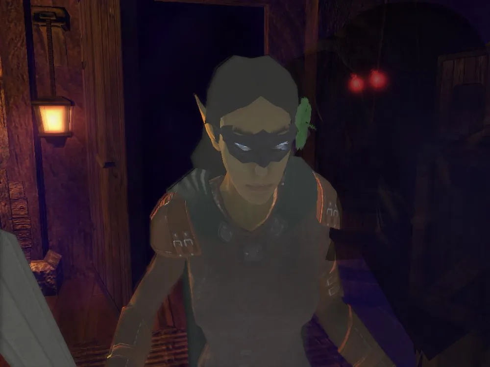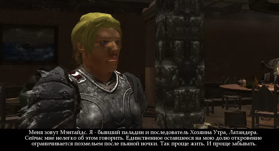 Посреди зала пьяное быдло приставало к бывшему паладину по имени Ментайдс. Когда терпение последнего почти лопнуло, Вы вмешались и остановили кровопролитие, получив уважение Ментайдса. Бывший паладин узнал Ринару. Когда-то Ментайдс вступил в неравный бой с восемью ночными масками и убил их всех, Ринара была девятой, сбежавшей. Самое странное, что идейные враги – паладин и нейтрально-злая преступница не стали собачиться, а, вопреки законам серии, на удивление по-взрослому договорились между собой.