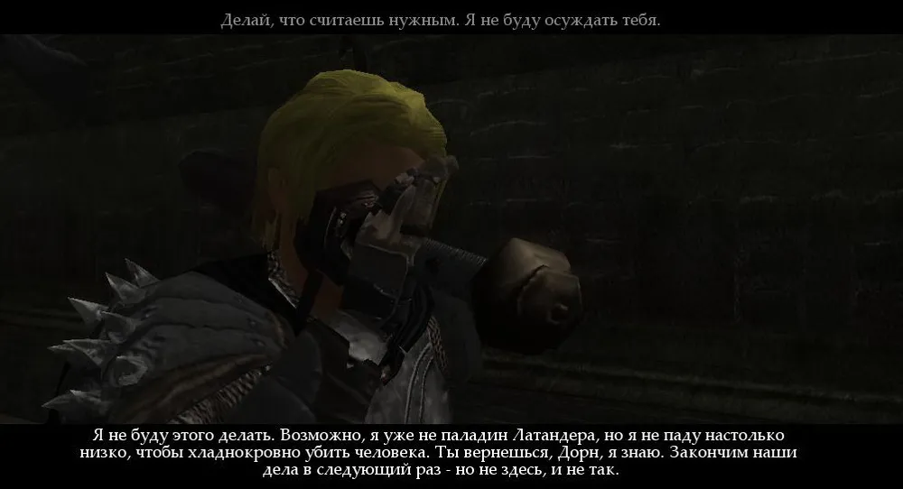 В очередной раз проходя мимо арены, Вы вспомнили, что собирались попробовать себя в качестве гладиатора. Бои двух видов – индивидуальные и командные. После первой схватки появился Дорн – заклятый враг Ментайдса. Однажды его шестнадцатилетний сын Джаек решил податься в преступники. И надо же такому случиться – не успел подросток надеть ночную маску, как напоролся на накаченного паладина. С тех пор безутешный отец искал способа отомстить Ментайдсу. Конечно же, наши победили. Когда бывший слуга света попросил у Вас совета, что делать с Дорном, Вы подтолкнули его либо к Латандеру, либо к Шар.