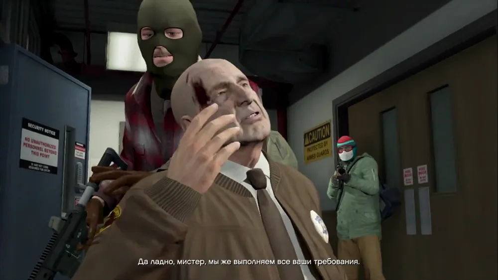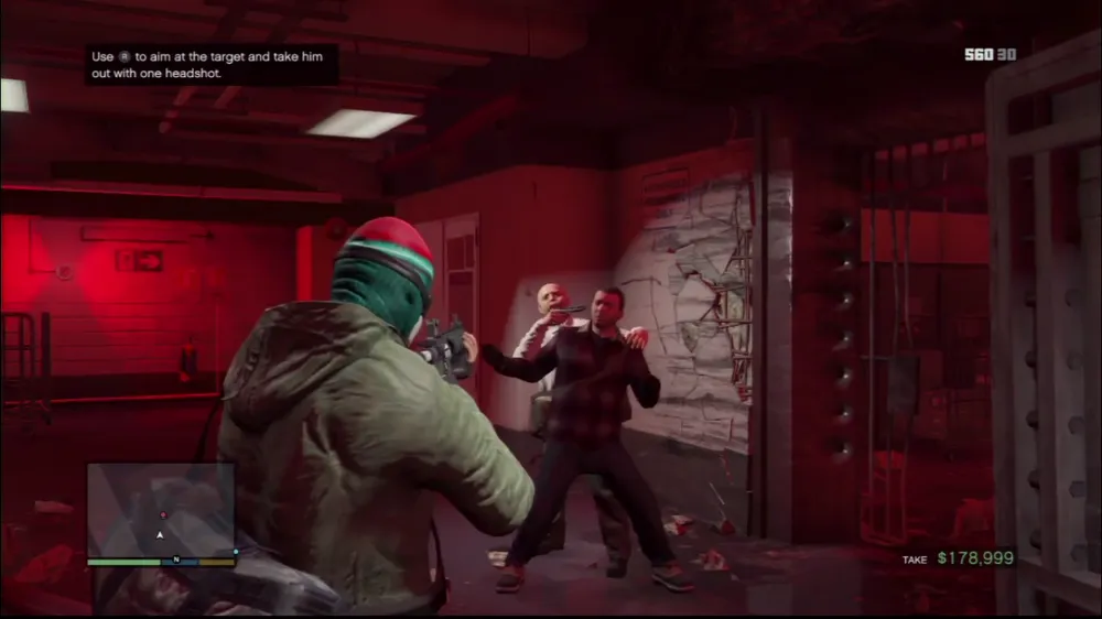 Толкнаем двойные двери и поворачиваем налево в коридор к разрушенному хранилищу (отмечено желтым маркером на радаре), затем двигаемся к деньгам (отмечены зеленым маркером на радаре), сложенным в углу. Майкл и Тревор станут запихивать в свои сумки наличные. Когда сцена закончится, следуем за Тревором из хранилища. Храбрый (и глупый) охранник захватывает Майкла, наставляя пистолет к его виску. Охранник сдергивает лыжную маску с головы Майкла и говорит, что запомнит его лицо. Это побуждает Майкла ответить: "Ты каждый день забываешь тысячу мелочей. Пусть эта будет одна из них" (Запомните эту фразу!).