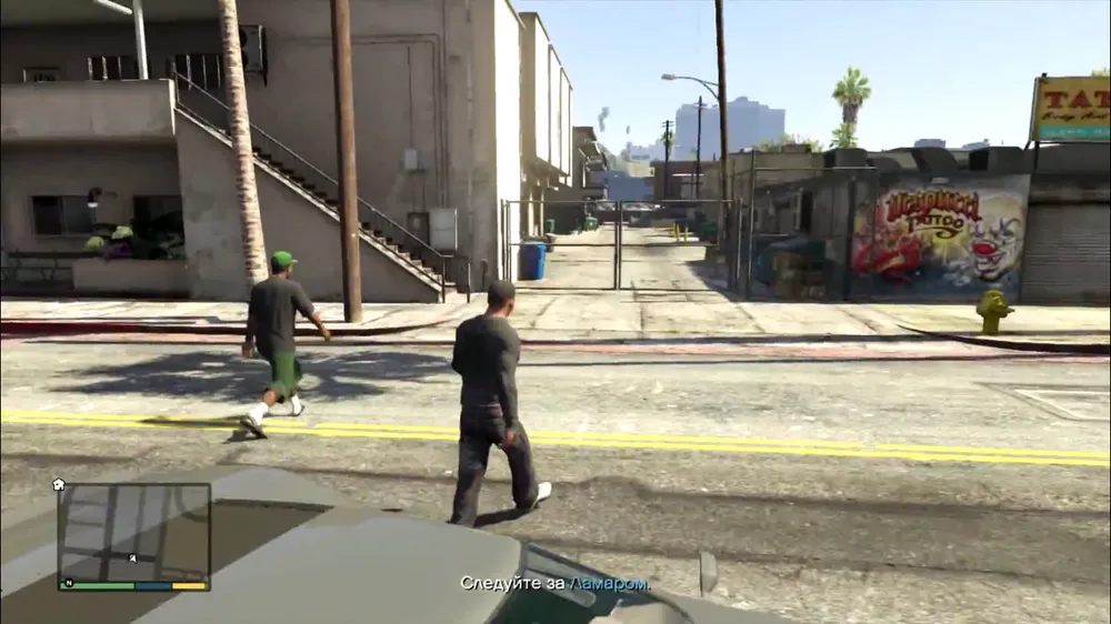 Вместе с Ламаром следуем к желтому маркеру. В пути Франклин вспоминает, что покупатель байка не был простым парнем, а татуированным гангстером из банды Вагос. Наша работа не будет легкой прогулкой. Когда мы подъезжаем к желтому маркеру (цифра 2 на карте) на Меланома-стрит рядом с магазином татуировок, Франклин автоматически останавливает автомобиль и Ламар выходит из машины.