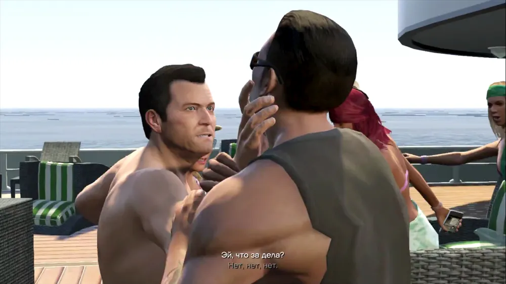 Джимми говорит Майклу, что его сестра Трейси тусуется с продюсерами и чуваками из порно-индустрии на соседней яхте (не просто так мы оказались на этом пирсе). Майкл, конечно же, в гневе, бежит по пирсу к океану, и мы ныряем в воду.