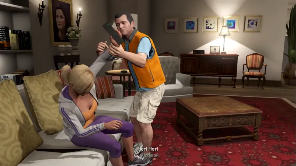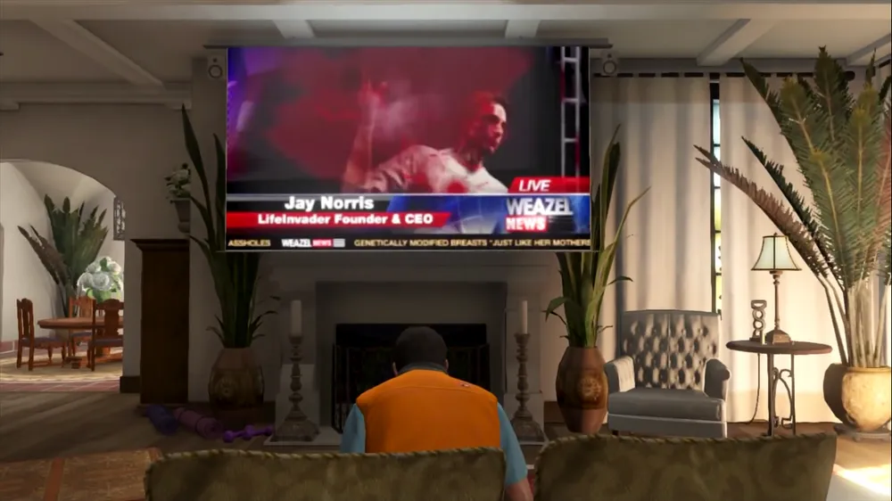 Следуем в дом Майкла (цифра 4 на карте) и заходим внутрь. В гостиной Майкл забирает пульт от телевизора у Трейси, которая смотрела ее любимое шоу "Стыд или Слава", и прогоняет ее. Переключаем на Weazel News, где идет прямая трансляция речи Джея Норриса.