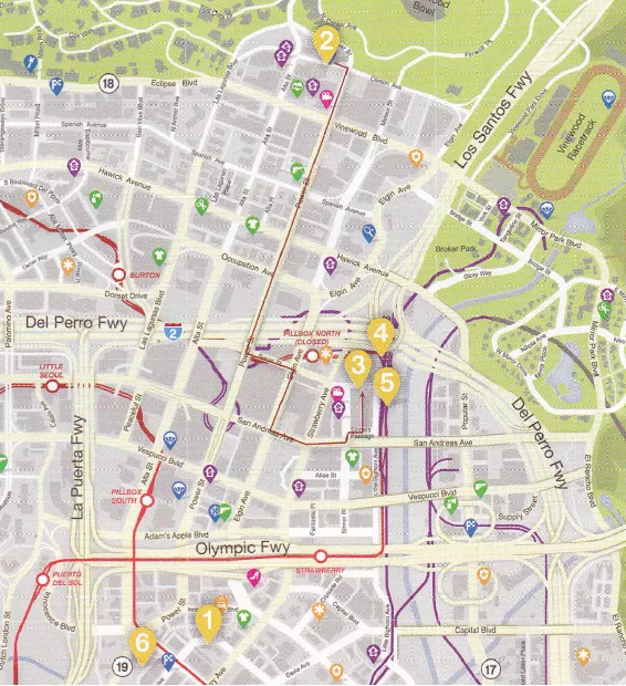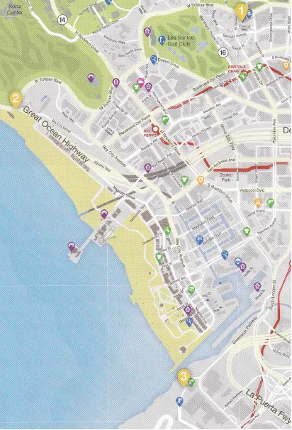 Следуем по желтому маршруту, пытаясь обогнать Джимми. Где-то на середине пути, Джимми поворачивает направо к тротуару на береговой линии и ускоряется. Используем пляжную дорожку, сокращая путь, и по лестнице (цифра 3 на карте) заезжаем на пирс. На самом деле не имеет значения, побеждаем мы или проигрываем, просто получаем различные варианты диалогов между Майклом и Джимми в конце гонки.