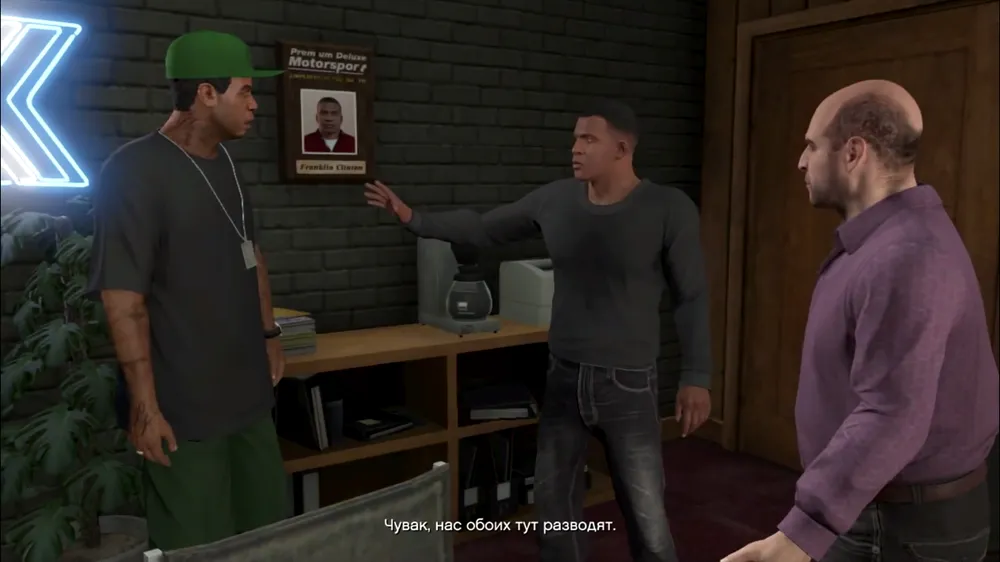 Садимся в машину и ждем Ламара. Следуем по желтому маршруту к точке назначения. Слушаем беседу между корешами. Паркуемся в гараже и Франклин посылает Ламара куда подальше.