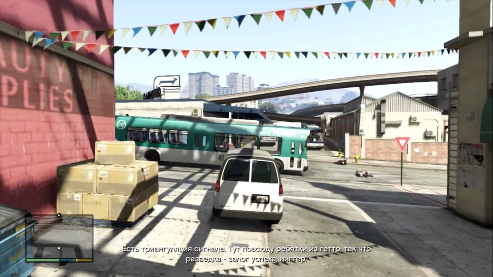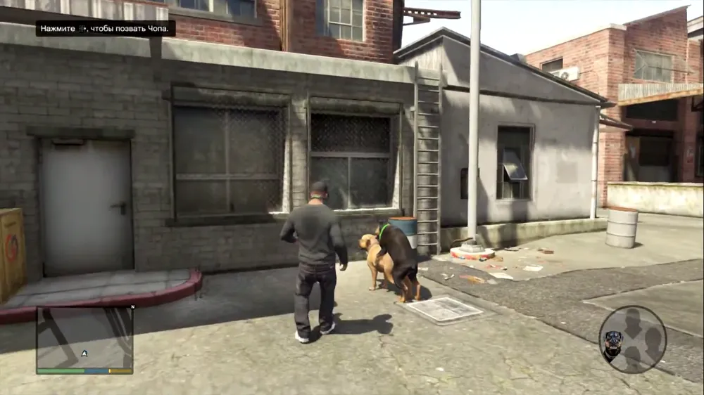Ламар отмечен синим маркером на радаре. Выходим из автомобиля и следуем за ним к высокому забору и перелазим через него. Продолжаем идти за Ламаром мимо пьянчуги до конца переулка, где три гаража отмечены желтыми маркерами на радаре (цифра 3 на карте).
