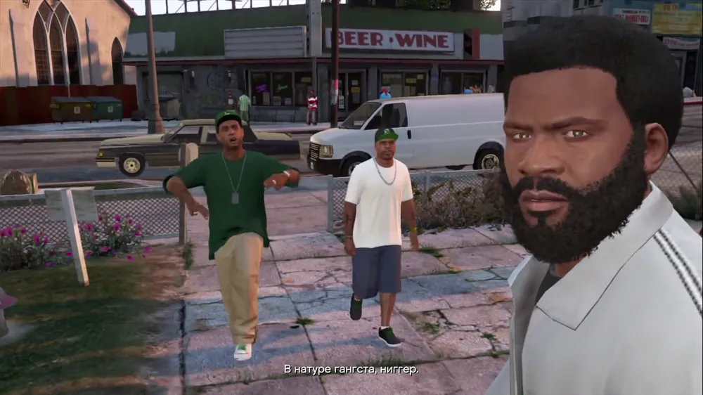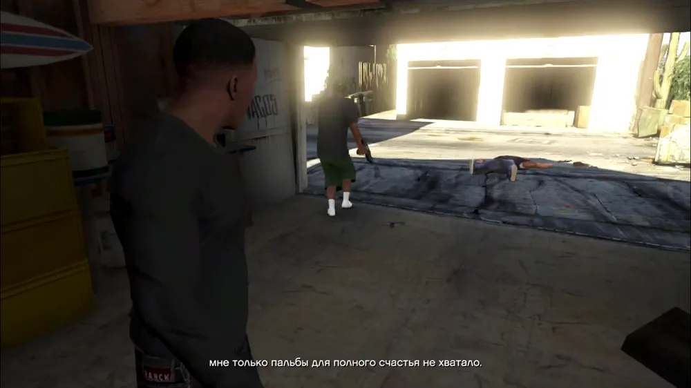 Открываем правый гараж. Несколько «вагосов» хотят знать, что происходит. В ответ Ламар убивает одного из них. Начинается перестрелка, но Франклин безоружен.