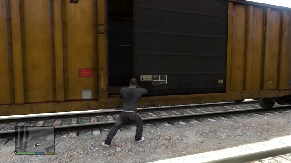 Следуем за своим партнерами через взорванный дверной проем. Идем к зеленому маркеру на радаре, который отмечает местоположение выключателя для дверей. Просто приближаемся к выключателю, и Тревор автоматически нажмет на него, чтобы открыть ставни.