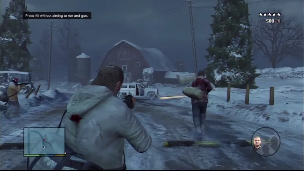 Играем за Тревора. Мы можем ввязаться в перестрелку с все больше прибывающими полицейскими или сразу убежать направо, где женщина выбегает из соседнего дома и Тревор берет ее в заложники. Сцена заканчивается, когда Тревор убегает по открытой заснеженной местности, преследуемый полицейскими.
