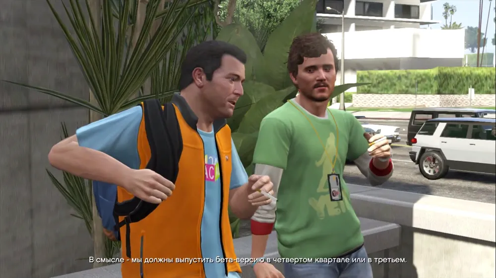Доезжаем до здания Lifeinvader и идем к запертой задней двери. Майкл достает сигарету, но какой-то программист выходить перекурить. После короткого диалога, молодой человек позволяет Майклу войти, предполагая, что он - временный айтишник, и просит помочь.
