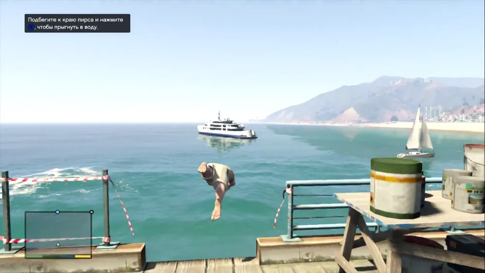 Идем к стойке проката велосипедов мистера Споука, затем выбираем один из велосипедов, выстроенных в ряд. Майкл садится на велосипед, и гонка между отцом и сыном к концу пирса (цифра 4 на карте) начинается. Джимми отмечен на радаре в виде синего маркера.