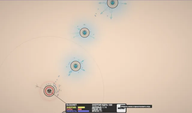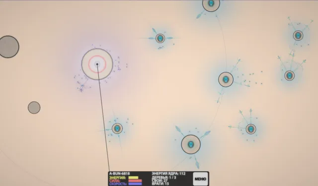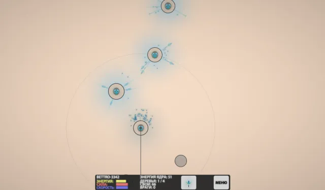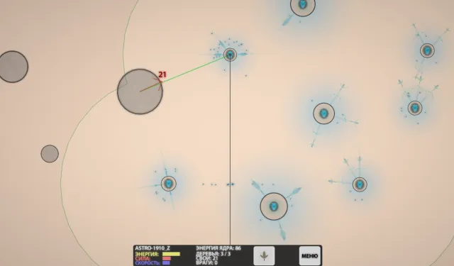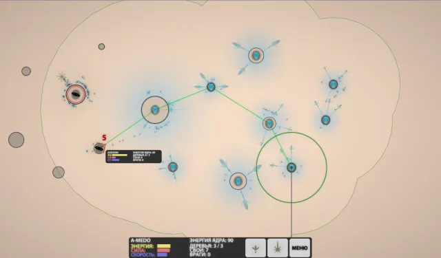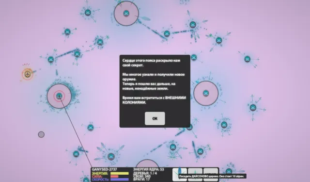 Чтобы увидеть характеристики выбранного астероида, на него нужно кликнуть мышью. У каждого астероида есть три характеристики: Энергия, Сила и Скорость. Дальше нам объяснят, чем они различаются. Они влияют на виды зернышек, которые может вырастить дайсоново дерево, посаженное на этом астероиде.