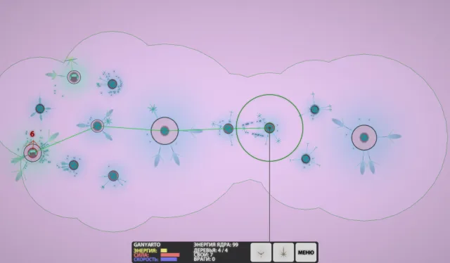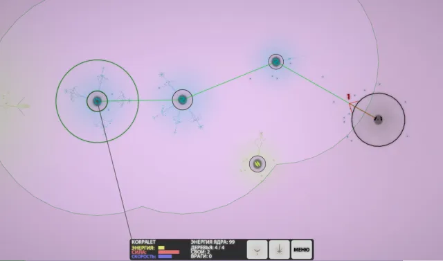 Первым делом решаю избавиться от небольшого вражеского поста между моими астероидами, атакую его. Он быстро сдается, и я высаживаю на нем пару деревьев. Теперь я думаю, мне по силам справиться с главной вражеской базой. Досаживаю оставшийся астероид деревьями, коплю силы и с опаской поглядываю на крутящиеся вокруг большого астероида, вражеские зернышки. Но темп роста вражеских зернышек отстает от темпа роста моего войска. Ещё бы пять астероидов с четырьмя деревьями, правда не на всех, или один с одним деревом… Когда достигаю двукратного преимущества, атакую. Только вот, не все мои зернышки не так могучи, как у противника. Но постоянный приток свежих сил ломит и сильных, не давая им восстановиться. В какой-то момент, между моими и вражескими зернышками устанавливается паритет, но затем число моих бойцов растет. Энергия вражеского астероида начинает падать и Вуаля, он мой! Но это только начало основной задачи миссии.