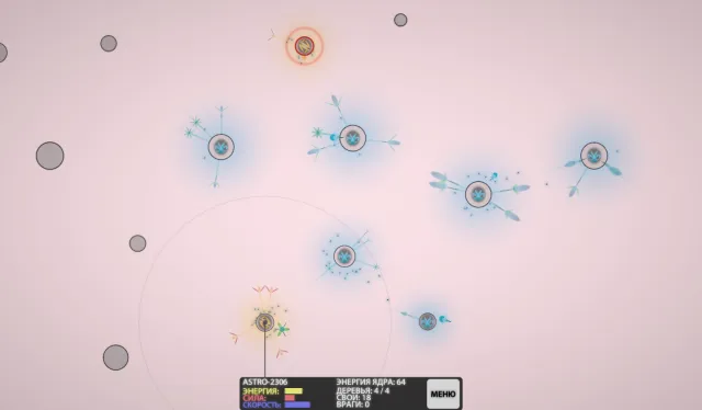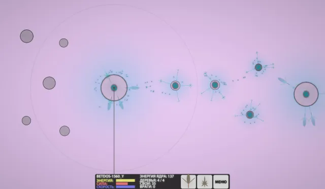 Начав с сотней зёрен, атакую всеми силами соседний астероид, быстро захватываю его, продолжаю поиск астероидов с Семенными деревьями. Так как захватить астероид с Защитным деревом просто невозможно! Бесполезное занятие. Просто обхожу их пока стороной.