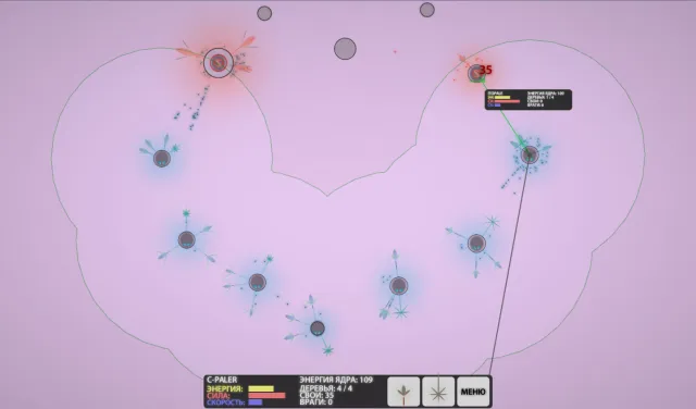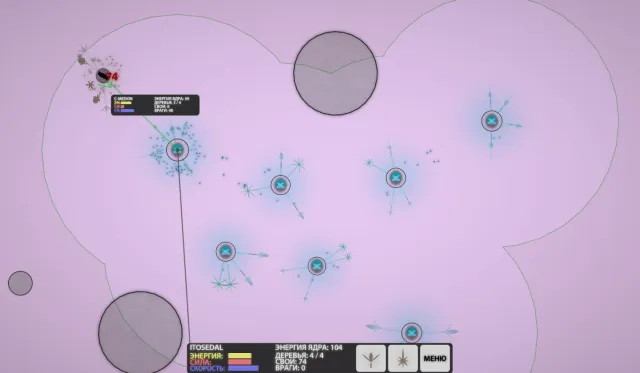 Здесь, казалось бы, надо быстро сажать Семенные и Защитные деревья, но необходимо, как и говорилось ранее, оставлять некоторое число зернышек для защиты. Идет борьба на два фронта против «Серых” и Розовых - другой древесной империи. Остается только ждать, когда они сами нападут, чтобы разбить их при помощи Защитных и близко выпочковывающихся зёрнышек. «Серые» волнами пробуют мою оборону на зуб, но в основном приходится следить за "Розовыми".