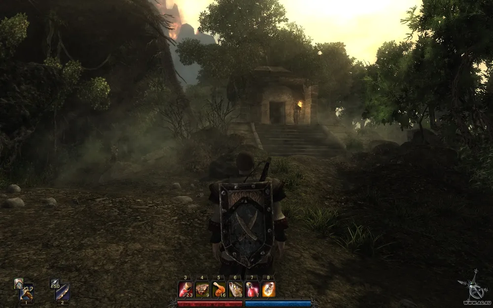 Попросите Яна отвести вас к лагерю бандитов. По пути лучше не сильно сходить с дороги, так как это может быть опасным для непрокачанного героя. Особенно встреча с кабанами. Ян укажет на развалины и людей ордена – скажет что если они вас увидят, то отмутузят и уволокут в монастырь. Нам такая перспектива не очень интересна, так как если вы даже хотите стать магом, то прежде надо идти в Харбор – Таун и принимать там сторону Ордена. Ян приводит нас к дороге к болоту и откланявшись удаляется. По пути встретим охотника Дага. С ним можно поторговать ( продать всякое барахло можно, но вот покупать пока ничего не советую). Так же он расскажет о геополитической обстановке и скажет, что научить охотиться нас может Луис.