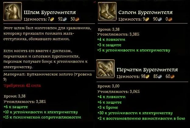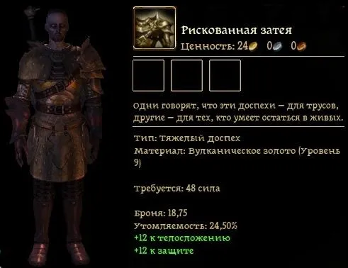 Когда вы принесете Вейду кусок брони Голема из Преисподней, он решит сделать массивный доспех (с бонусами к силе, телосложению, физической сопротивляемости и устойчивости к огню) и выдаст следующий список необходимых ингредиентов:
