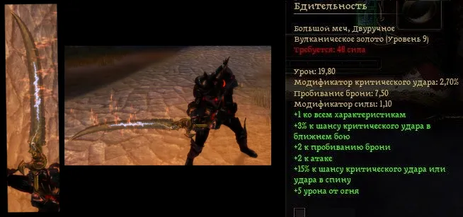 Двуручный и одноручный мечи не имеют различий в бонусах. В дополнение к базовым характеристикам Вейд предложит подработать меч для разных задач, а можно дать вам выбрать бонусы самостоятельно. Это один из лучших мечей в аддоне, удостоившийся отдельного упоминания в эпилоге.