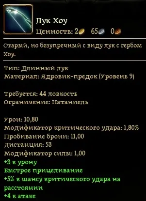 Натаниэль – Лук Хоу (особый подарок, в авварском склепе под Башней Бдения); Письма Делайлы (Подземелья);
