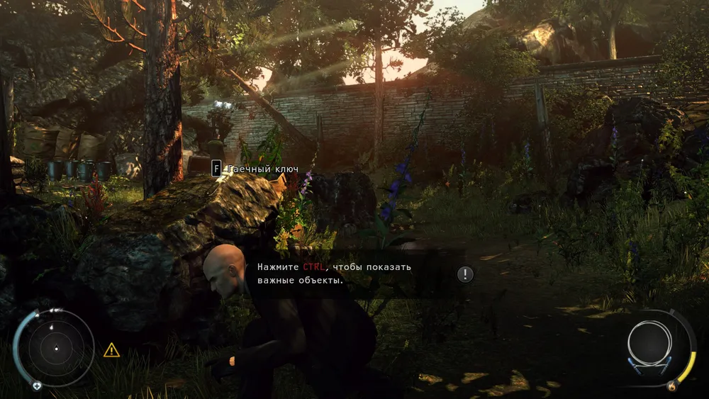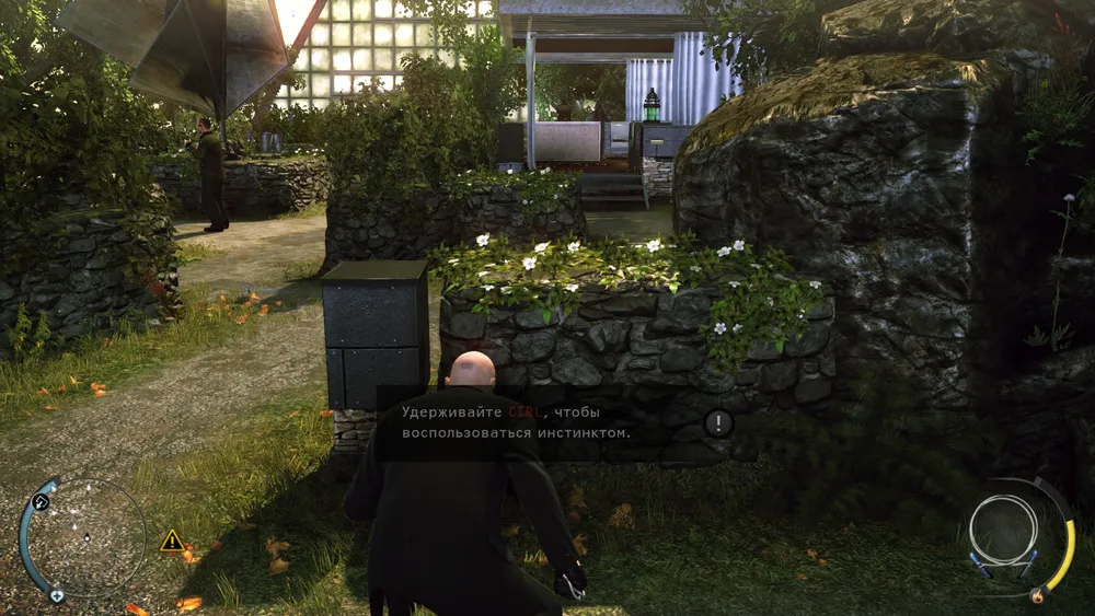 Садовник встревожится и встанет. Как только он начнёт идти к месту падения ножа, быстро целимся в самое левое нижнее окно оранжереи и стреляем. Охранник насторожится и пойдёт проверять оранжерею внутри. Стрелять и бросать нож надо в режиме прислонения к камню, иначе вас заметят. Целиться надо тоже доли секунды. Когда садовник подойдёт к ножу, чтобы присесть и изучить место, выходим из укрытия и, присев, идём к охраннику. Убедитесь, что садовник присел спиной ко входу. Обычно, как только вы доходите до входа в оранжерею, охранник входит в неё и заворачивает за угол налево. Пытаться сразу зайти внутрь и повернуть направо почти бессмысленно, так как ещё один охранник у правой стены оранжереи пасёт вход, вращая головой (а всего охранников на правой стороне трое). Дождаться момента, когда он отвернёт голову в сторону от входа, нереал, так как сзади через несколько мгновений садовник, изучающий нож, оборачивается и замечает вас.