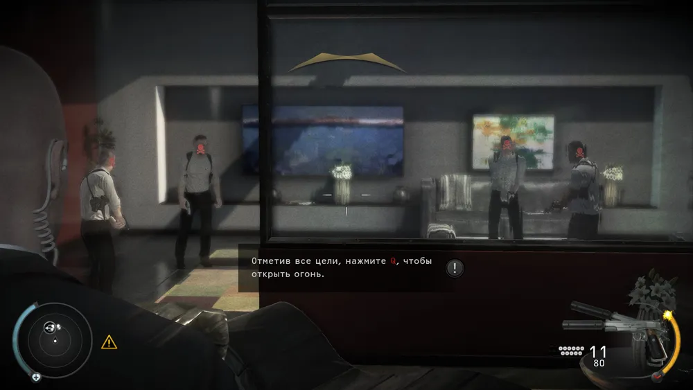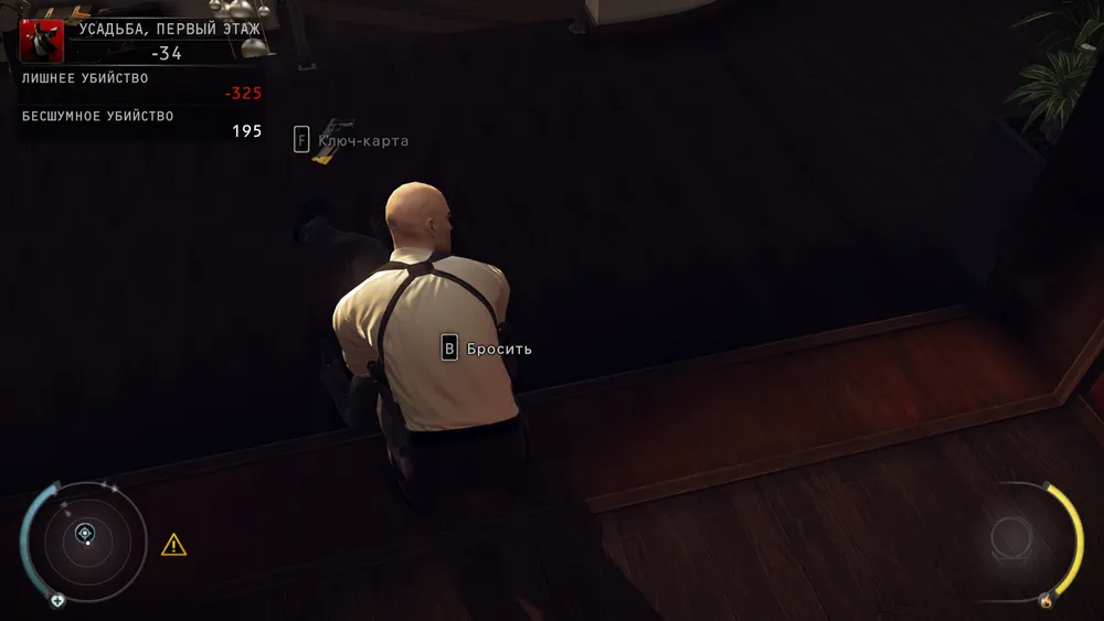 Вот и второй охранник. Тут варианта три: пистолет (цифра 1 на основной клавиатуре), придушить струной (цифра2 на основной клавиатуре) или рискнуть проскочить мимо.