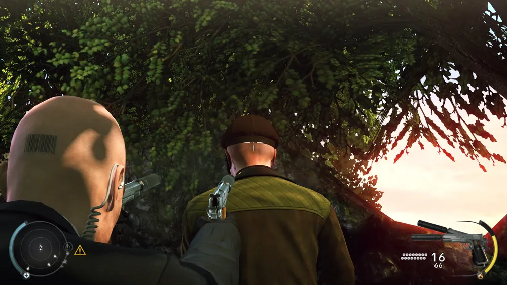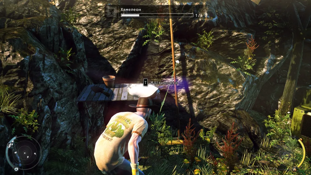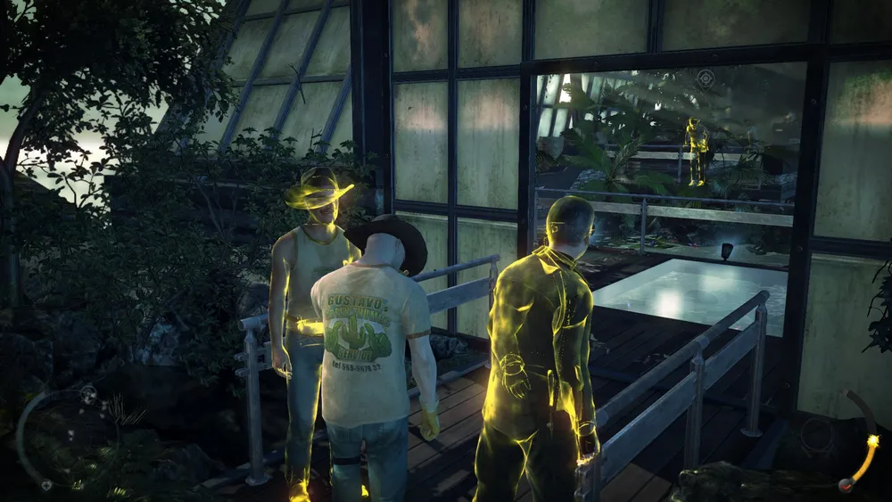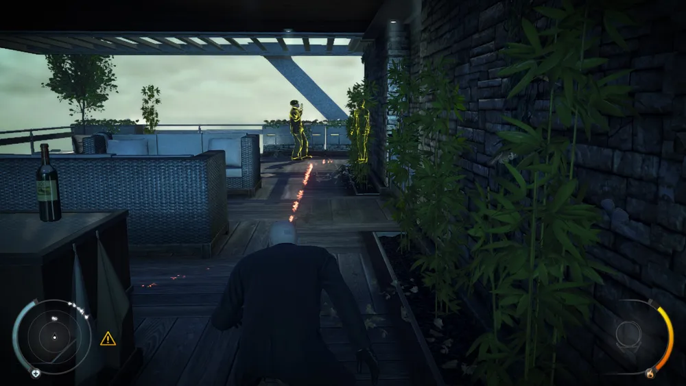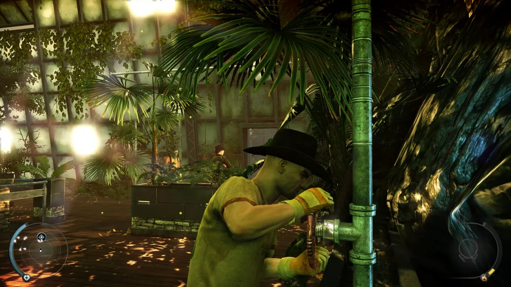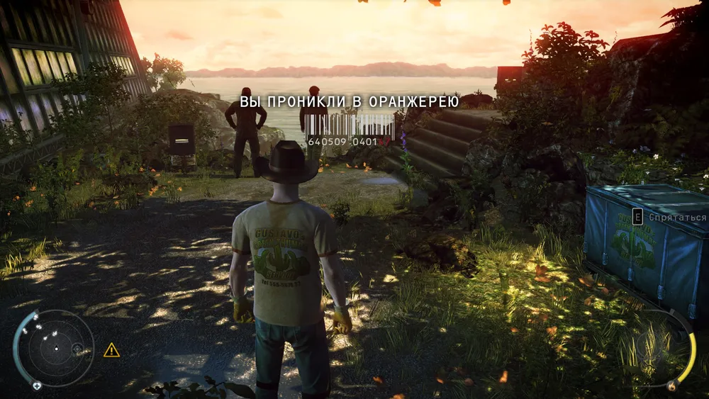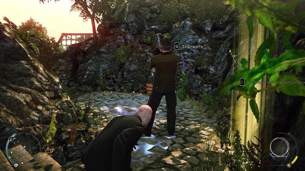 Все 3 охранника справа будут отвлечены звуком; заходим в оранжерею и поворачиваем направо. Не забываем, что слева всё ещё стоит озадаченный охранник, который должен вернуться на прежнее место у входа, так что прячемся от него за углом. Как только он уйдёт, сразу же перемещаемся за угол обратно, чтобы не попасть в поле зрения 2-х оставшихся охранников. Если выйти из-за угла и подойти немного к ближайшему охраннику, то запустится скрипт-беседа между ним и его напарником. После разговора они разойдутся, первый пойдёт влево, в этот момент надо пересечь центральную часть оранжереи, а второй встанет на мостик, чтобы полюбоваться водичкой. Проходим у него за спиной. Далее крутим вентиль, мокрые охранники выходят наружу к краю скалы, а Хитмэн незаметно переходит в следующую главу.