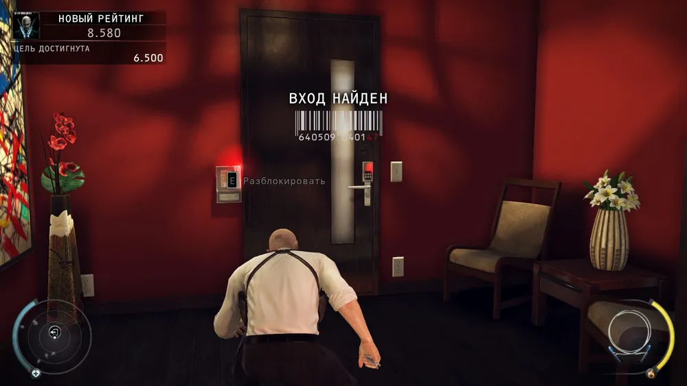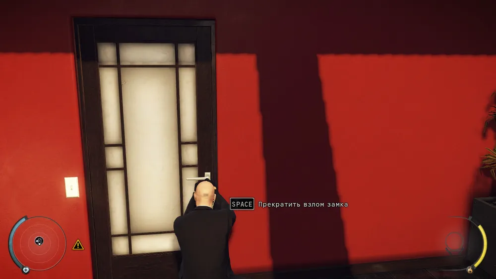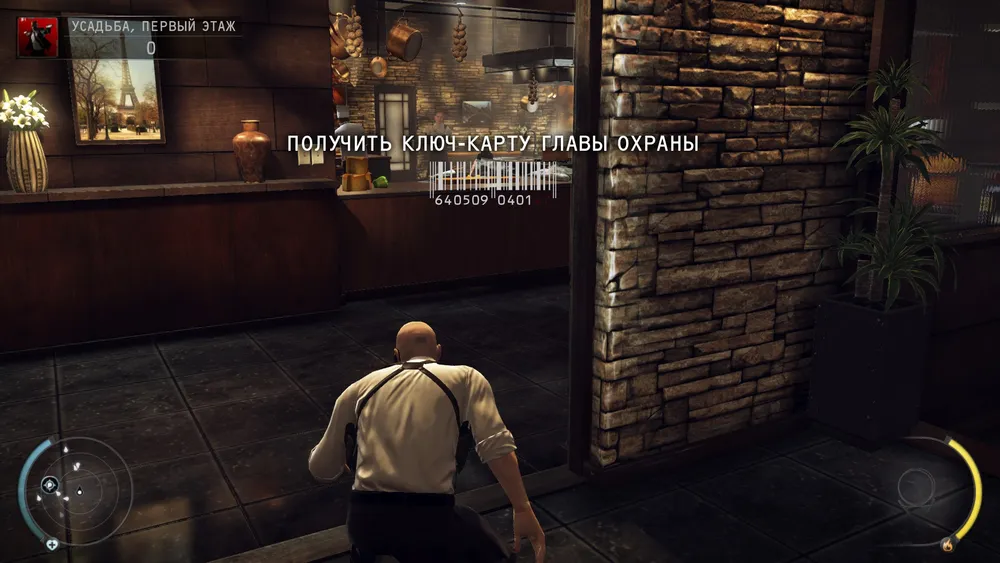 Как только охранник на кухне уйдёт, ждём, когда повар встанет спиной к вам и боком к выходу к стойке бара. Проходим мимо, прислоняемся к бару, убеждаемся, что никто не смотрит, и подсыпаем снотворное в кофе. Ждём, пока глава охраны выпьет кофе, почувствует сонливость и уйдёт за угол. Возвращаемся в кухню. Повар должен быть спиной к двери, за которой лежит без сознания начальник. Быстро проскальзываем через дверь, подбираем ключ-карту, а начальника засовываем в шкаф. На кухню возвращаемся осторожно, дверь открывать надо так, чтобы сам Хитмэн был сбоку от неё (иначе повар его заметит, если будет стоять лицом к двери).