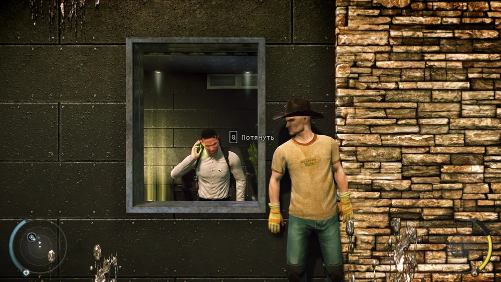 Добираемся до охранника разговаривающего по сотовому и созерцающего мутные воды. Нажимаем на Q, и…..