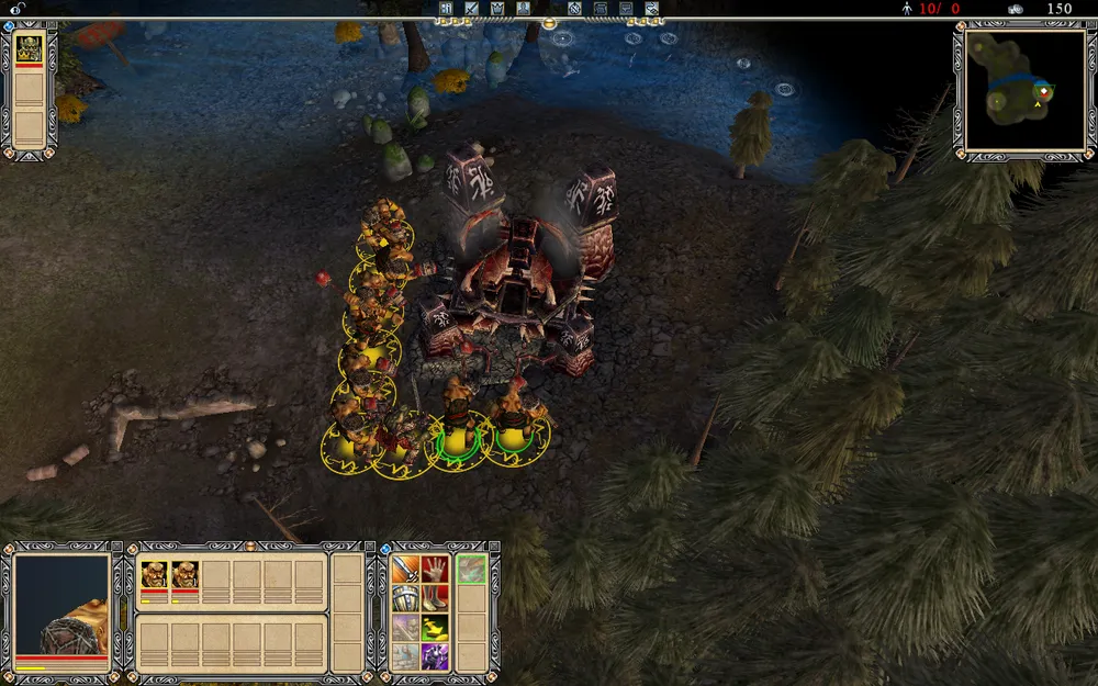10. Очень большая карта, которую придётся очень долго зачищать от врагов. Для начала отбейте ближайший рудник. Потом отбейте ещё один - на юге, немного западнее вашей базы. Теперь собираем войско и идём чистить карту. Начать лучше с востока. На северо - востоке, кстати, вам встретится Ксорин и попросит принести ему колесо. Его вы найдёте недалеко от главной базы врага на западе. Теперь, используя катапульты, Оггок взять будет куда легче. Атакуйте издалека и разносите базу осадными орудиями. А потом обводите зелёной рамкой всё войско - и вперёд, на Оггок!