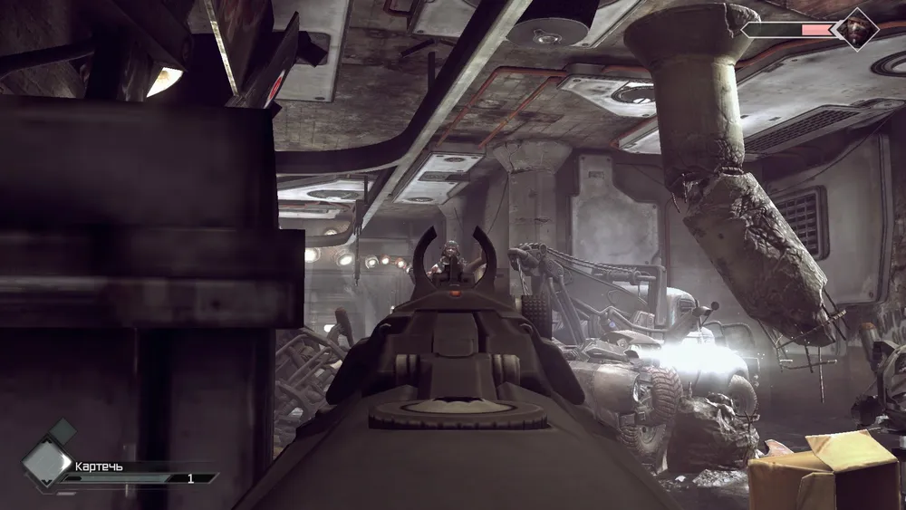 Запрыгивайте в неё. Внутри мы будем отбиваться от нескольких волн мутов. Они шустрые и больно бьют. Поэтому старайтесь держать их на расстоянии, но если подошли, бейте прикладом.