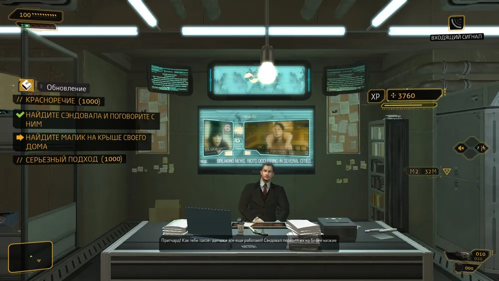 Прилетев в штаб идём к Шарифу. Но его не окажется у себя, а там будет сидеть человек, который фактически придумал импланты.