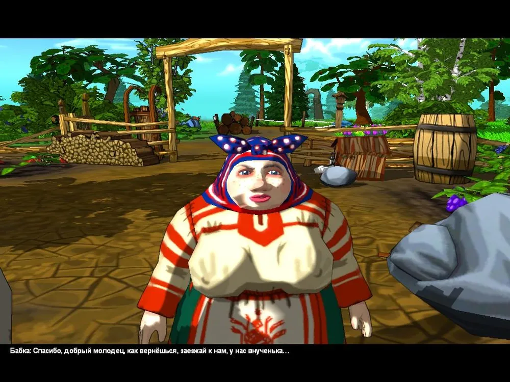 Алеша придумает способ убить врагов. Отправляйтесь на нужное место. Переключайтесь на Добрыню и перепрыгивайте через бревна. Как на вас обратят внимание, прыгайте назад и, переключившись на лук, попадите в цель на пригорке. Бревна упадут и раздавят всех. Освободите крестьян из лагеря разбойников. Крестьяне попросят освободить форт для защиты деревни. Бегите и убейте всех врагов. После этого сходите к кузнецу. Он пообещает улучшить оружие. Чтобы получить его отправляйтесь к другу кузнеца, который живет на острове. Прыгайте к нему, используя оглоблю, и поговорите с ним. Возвращайтесь к кузнецу и заберите оружие. После смотрите на карту и проходите в следующий уровень.
