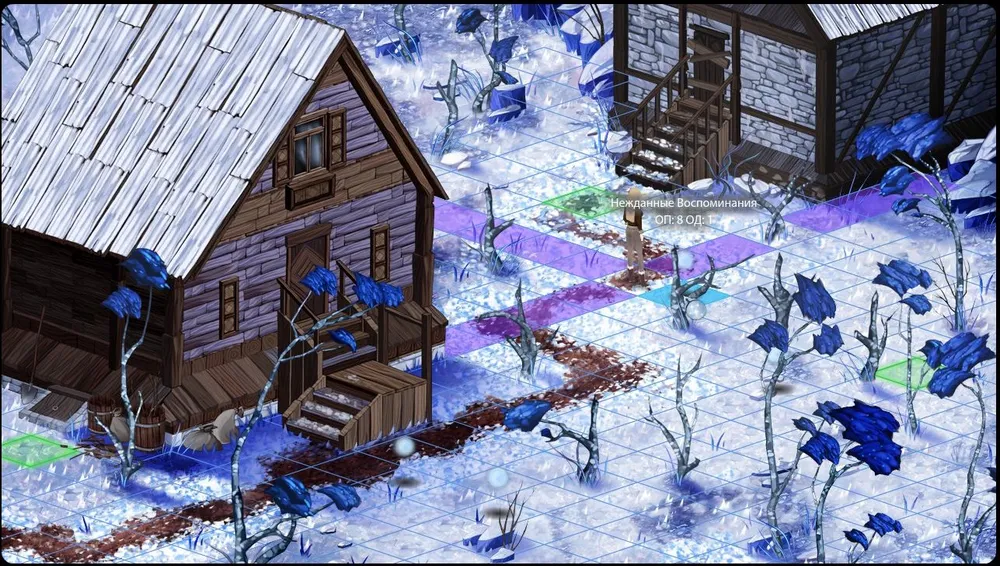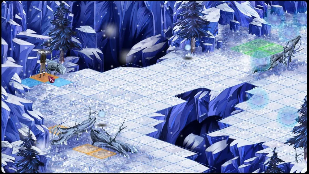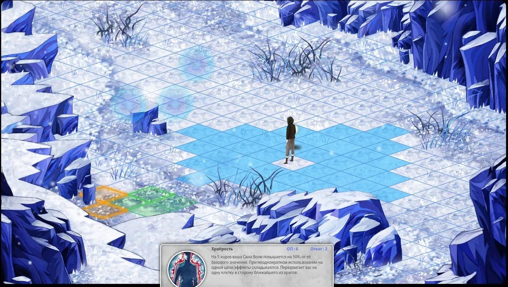Здесь опять можно накопить 6-7 ходов, чтобы сразу пройти к зеленым клеткам. Конечно, можно пройти к правому укрытию, но мне кажется это тупиком, сложно выбраться оттуда, без навыков, повышающих MP. Вьюги могут долго вас мурыжить, отталкивая назад. Главное, чтобы они вас не отталкивали на ловушки. Следует использовать Храбрость, чтобы сэкономить очки движения. Надо идти к самому правому врагу, чтобы не вас не задевали остальные Вьюги. Для отвлечения и укрытия за ним, можно вызвать сильного союзника – Аромата.