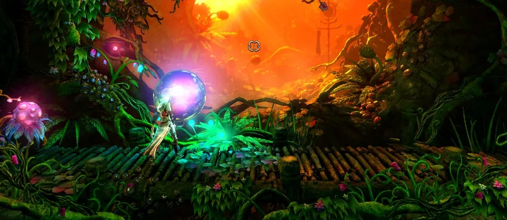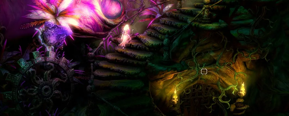 Прыгаем на это самое бревно, потом на второе, а с него, вниз. Уничтожаем врагов. Далее, берем ящик и закрываем огонь чуть впереди. Встаем у рычага и создаем на платформе над собой средненький ящик. Важно то, что ящик не должен мешать колесу. Теперь делаем все быстро: тянем рычаг, перемещаем ящик вплотную к колесу. Ящик должен блокировать колесо, тем самым дверь спереди будет держаться открытой. Далее еще одна головоломка. Берите слева прямую трубу и насаживайте на правую сторону. Далее слева берем дугообразную и насаживаем туда направо на первую нами поставленную трубу. Прыгаем, разбегаемся по трубе и попадаем на ту сторону. Убиваем неприятелей и проходим вперед, убирая с пути мешающийся булыжник. Далее буду аж 4 источника огня. Над ними бревно на рельсах, толкаем телекинезом бревно вперед и с Зои цепляемся за него. Раскачиваемся немного и прыгаем. Встречаемся с огромной лягушкой. Срываем сверху фрукт, которые она так любит, подносим к ней, и сразу в тот момент, когда она высовывает язык, прыгаем на него и пробегаем. Очередной раз минусуем гоблинов. Расправившись, создаем ящик, прыгаем на него, оттуда на платформу, на которой пару мгновений назад был болотный враг. Чуть пройдя вперед обходим опасность, прыгая по подвесным балкам. Будьте осторожны, они обваливаются. Перепрыгиваем опасные пламенные трубы, далее по грибам, зацепляемся за те платформы что выше других. Перемещаемся с одной на другую. Расправившись с одним гоблином, прыгаем на мыльный пузырь, создаем Магом коробку и двигаем его нашим ящиком в нужную нам сторону. Снова гоблины, убиваем их. Завершающая главу головоломка. Берем первую трубу над рычагом, и вторую около огня. Одеваем по очереди на трубу, с которой хлыщет огонь, и если все правильно сделали, то убираем препятствие - улей. Дергаем второй рычаг, открывается дверь, заходим в нее, смотрим сценку с цветком. Конец уровня!