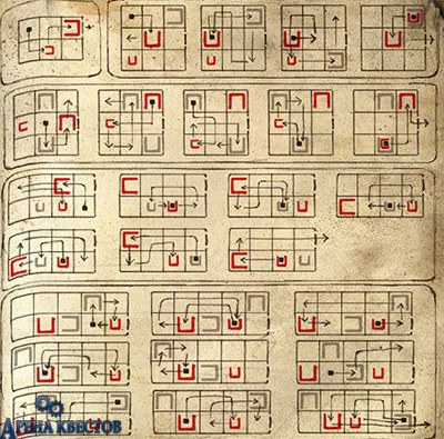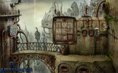 В переходе мы встретим компанию музыкантов, у каждого из них проблема с инструментами. Идем в бар, в правой части бара, с верхней полки берем клейкую ленту от мух, предварительно увеличив ГГ. Подсаживаемся к роботу, который играет в какую-то игру. Правила ее очень просты нужно выстроить в любом направлении цепочку из пяти винтиков, и не дать сделать того же самого сопернику. Игра не проста, но немного потренировавшись, победа придет. Проиграв, соперник в бешенстве стукнет по доске и все гайки разлетятся. Собираем их по всему бару, смотрим в дверь справа, там сидят эти гадкие бандюги. Выходим из бара, подходим к вонючей цистерне и применяем на нее липкую ленту, получаем мух. Заходим в бар, напускаем мух на бармена, забираем бочку. Отдаем бочку барабанщику, а гайки – саксофонисту. Подбираем растенье, которое останется от упавшего горшка. Поднимаемся по лестнице, прямо да главной площади. С перил, напротив фонтана, берем ручку. Ручку вставляем в отверстие в стене, рядом с девушкой. Крутим ручку так, чтобы красная стрелка на городских часах стояла на позиции VI, а черная стрелка на третьем сверху против часовой стрелки знаке. Причем черная стрелка меняет свою позицию, когда красная проходит через XII часов. Робот, сидящий в будке наверху, уйдет, идем на его место, берем громкоговоритель. Говорим с роботом в инвалидной коляске, берем у него масленицу. Спускаемся к музыкантам, проходим в проход слева от них. Масленицу ставим на масляное пятно. Относим масленицу обратно роботу-инвалиду. Он смажет себя, и опять попросит принести масло, вновь берем масленицу. Поднимаемся по лестнице, которая находится рядом с девушкой-роботом. По лесенке поднимаемся на робота, выдергиваем шнур из розетки. Когда упадем, подтягиваем красный провод из левого отверстия. Открываем электрощиток в фонарном столбе, тут нас ожидает игра пятнашки. Двигаем пару плиток, вдруг одни плитка выпадет, и тут же ее подберет вредный попугай. Идем на середину моста, попугай последует за нами. Начинаем приседать и увеличивать ГГ, попугай будет все повторять. Быстро изменяем размер нашего героя, попугай раскачает провод и оборвет его. В следствии этого, попугай упадет и отдаст плитку. Порванный провод наматываем на забор. Вновь открываем щиток и собираем пятнашки, в законченном виде они должны выглядеть вот так:
