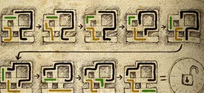 Итак, мы находимся прямо под столом, за которым сидит бандюга. Бандит вальяжно качается на стуле и стреляет в мишень. Когда он очередной раз качнется, просто дергаем за стул, бандит упадет. В то время, пока он еще не встал, быстро берем пули со стола. Бандит увидит, что пули закончились, и пойдет их отколупывать из мишени. Берем ключ у бандита, высыпаем пули на пол и вылезаем из люка. Ключ вставляем в панель, открывающую двери, ключ надо вставить в обе скважины. После этого опять спускаемся в люк. Ждем, когда выйдут двое заключенных, бандит побежит их арестовывать и споткнется. Вылезаем из люка, поднимаемся по лестнице и заходим в дверь. Смотрим в телескоп, вот где наши бандиты. Оказывается они не бандиты, а террористы, так как они задумали взорвать цитадель! Жмем на маленькую красненькую кнопочку рядом с телескопом, запоминаем время на часах – 4:45. Спускаемся в комнату, где сидел бандит, и заходим в дверь слева. Заходим в среднюю камеру, увеличиваем ГГ и с потолка берем вантуз. Выходим в коридор, подходим к левой двери. Нажимаем на кодовый замок, код 4:45, заходим в открывшуюся дверь. Нажимаем на сейф. Сейчас следует разгадать головоломку.