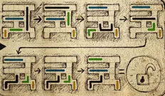 В инвентаре комбинируем магнитофон и громкоговоритель. Ставим магнитофон на стол, откручиваем резервуар. Выбираемся из канализации, подходим к фонтану, спрыгиваем вниз. Откручиваем моховик, пробираемся по трубе. Когда будем стоять на платформе, жмем на красную кнопку. Теперь рассматриваем головоломку в верхнем левом угле платформы. Ее смысл – нужно поменять местами красные и серые шарики. Вот решение: