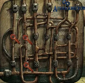 Если пятнашки собраны верно, то подастся напряжение. Залезаем на робота-стремянку и дергаем за хвост кота. Когда кота замкнет, в электрощитке сдвигаем с места любую плитку, подбираем кота. Спускаемся к музыкантам. Смотрим в огромную тубу самого левого музыканта. Запускаем в тубу кошку. Слушаем оркестр и поднимаем магнитофон. Возвращаемся к инвалиду, открываем люк и спускаемся в канализацию. Подходим к столу, справа, открываем его и берем блокнот. Долистываем до последней страницы, берем газовый ключ. Спускаемся в бассейн, смотрим в трубу. Поднимаемся обратно, смотрим на хитросплетенные трубы, на которых висит еще один газовый ключ, берем проволоку. Спускаемся в бассейн, ковыряемся в сливе проволокой, находим третий газовый ключ. Подходим к трубам и перекрываем их таким образом: