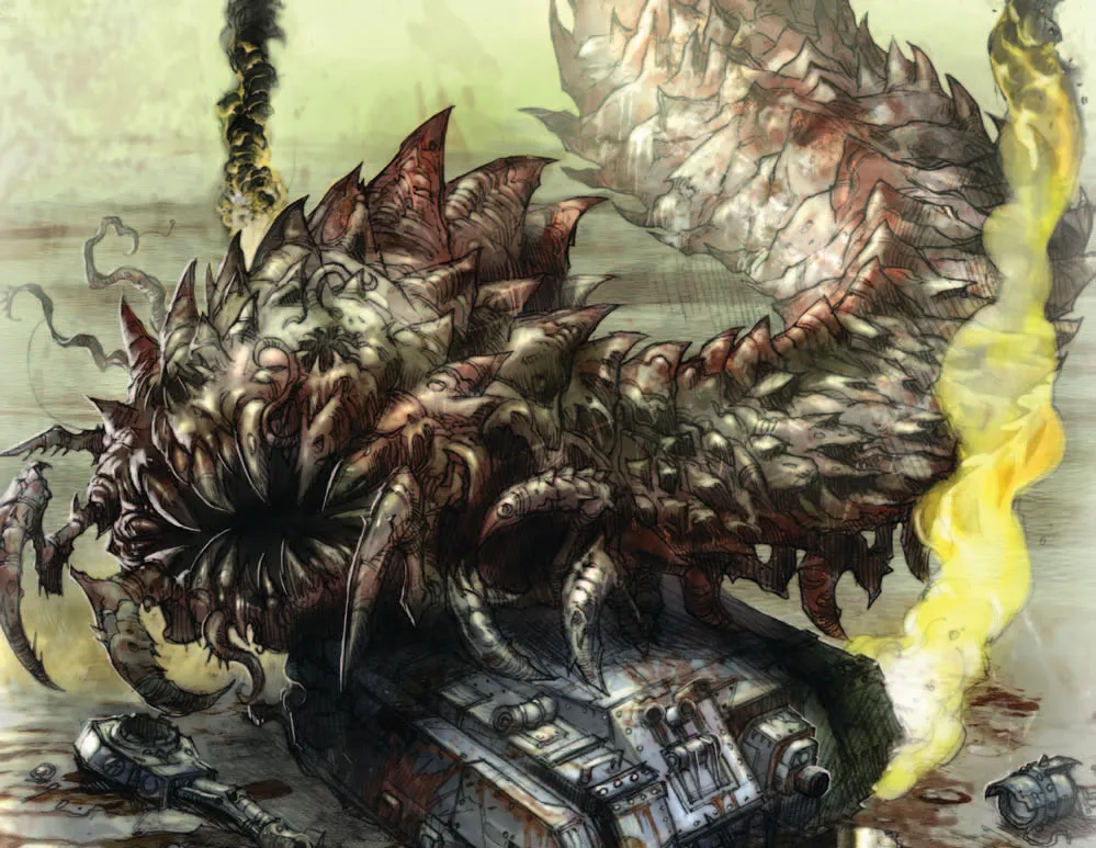 Дабы продемонстрировать вам силу оседекса, я высылаю вам пикт-изображение, на котором вы можете наблюдать то, что раньше называлось танком «Гибельный Клинок». Связь с высланным на дальний патруль танком оборвалась, когда он был атакован одним или несколькими оседексами, каждый по 30 метров длиной. Я считал эту историю шахтерской выдумкой до тех пор, пока во время одного из разведывательных вылетов не столкнулся с остатками скелетов оседексов. Щитки были целы, в то время как разлагающиеся останки тела растянулись на десятки метров...