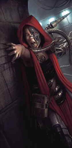Глаза одержимого сервитора – светящиеся варпом озера, видения их полны желанием убивать. Самодельный нож сжат металлическими пальцами, лицевые приводы щелкают и изгибаются непредусмотренным конструкцией образом. Сервитор крадется в глубинах ночных переулков, питаясь ужасом последних мгновений своих жертв.