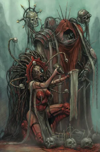 Глаза сервитора светятся, а порабощающие иглы торчат из его плоти и нейро-интерфейсов. Символы, вырезанные на бескровной плоти, сочатся воском, капающим на металл. За его телом волочится колдовской пергамент. Кровь человеческого жертвоприношения пала на сервитора, его осквернение не подлежит сомнению.