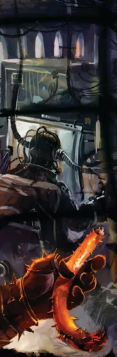 В легенде говорилось о темных богах, заключенных в руинах Старого Улья, там внизу, и посылающих еретических духов, чтобы захватить спящих и мертвых. Я пренебрег ею - глупая ошибка. Участь Управляющего Грукула не имеет значения, маловажное и скоро завершенное дело. Важны глубины переулков и крики Рин той ночью. Я бегом пронесся по последним уровням, фонарь моего дрона-черепа едва разгонял опустившуюся тьму, пока я бежал по мостам и переходам вниз. Я увидел кровь Рин, разбрызганную по стенам хибар, зараза варпа чувствовалась в воздухе. Торчавшие из обвалившихся уровней балки мерцали варповым светом. Вдруг на меня издали уставилась пара горящих глаза. Три раза выстрелив из хеллгана в темноту я бросился вперед, только для того чтобы увидеть ржавого сервитора, в линзах которого отражался свет фонаря. Недалеко лежал окровавленный нож, ставший смертью Рин.