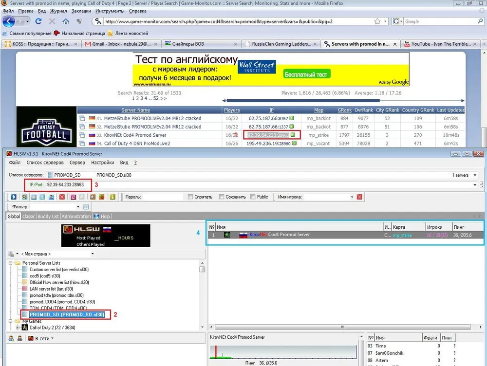Далее, идём на game-monitor.com, вбиваем в поле «Server with:» слово «promod», в списке «Playing:» выбираем Call of Duty 4, жмём Search. В появившемся списке серверов выбираем тот, который не имеет значка «замок» в графе Players, копируем его адрес из столбца IP, вставляем в наш HLSW Tool в поле IP/Port, предварительно выбрав созданный нами заранее список серверов. На следующем рисунке обозначены шаги добавления сервера.