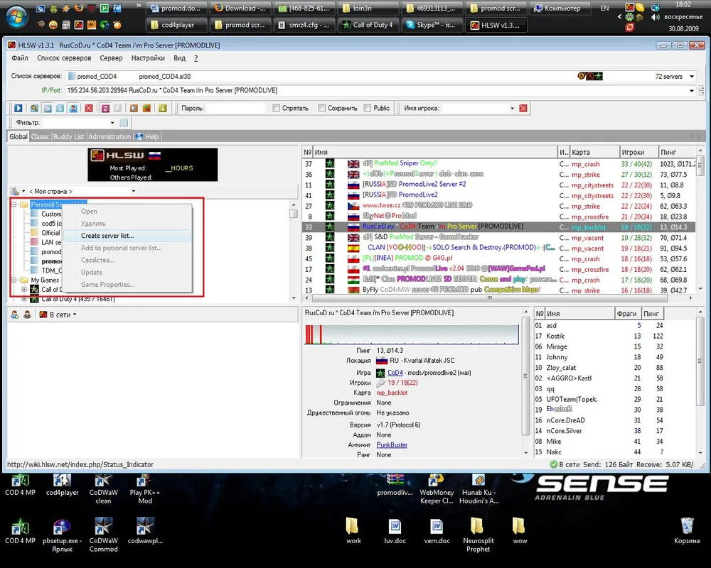 Щёлкаем правой кнопкой на папке Personal Sever Lists, далее Create Server List