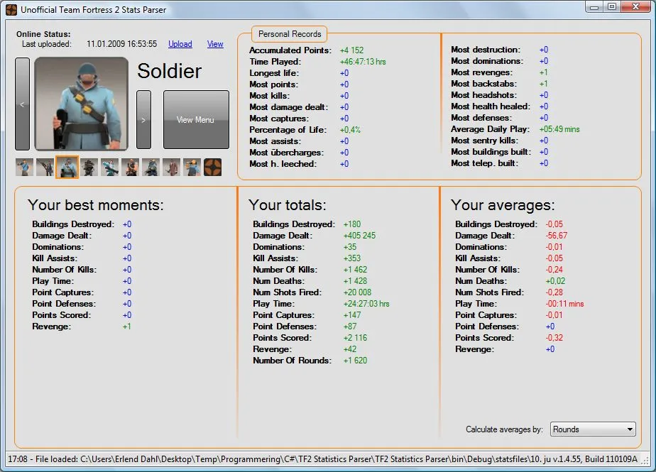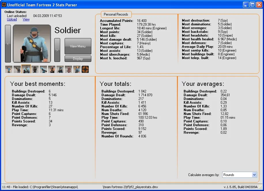 The Unofficial Team Fortress 2 Stats Parser приложение для просмотра статистики игры из локального файла, в котором содержится больше данных, чем показано в игре.