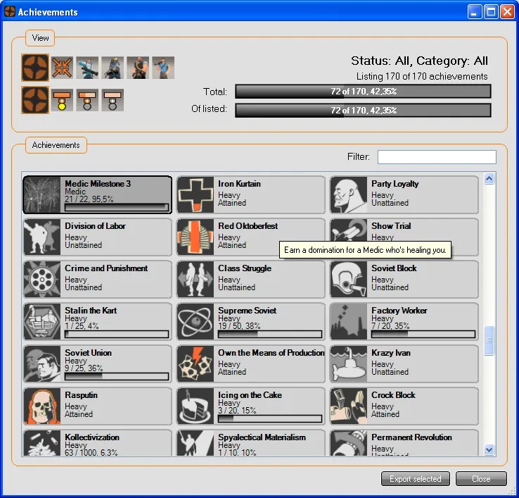 Просмотр достижений позволяет просматривать их в нескольких категориях ("Общие", "Медик", "Пиро" и т.д.), и ваш статус ("Достигнуто", "В процессе" или "Не достигнуто").